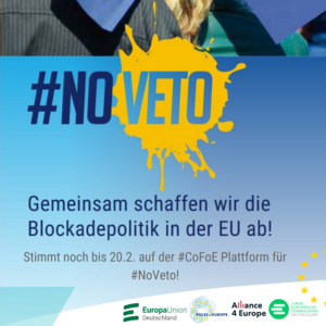 Nur noch bis zum 20. Februar kann man sich bei der Konferenz zur Zukunft Europas einbringen. Deshalb: Jetzt auf der Online-Plattform anmelden und die Forderung nach der Abschaffung des Einstimmigkeitsprinzips im Rat der EU unterstützen. Mit diesem Blockadeprivileg haben einzelne nationale Regierungen allein in den letzten drei Jahren mindestens 12 Entscheidungen zum Wohle aller Europäerinnen und Europäer verhindert.
