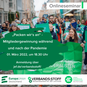Die Pandemie hält unsere Verbände seit zwei Jahren in Atem. Viele Aktivitäten von JEF und EUD wurden in den digitalen Raum verlegt, mussten abgesagt werden oder fanden nur in abgespeckter Form statt. Persönliche Begegnungen waren selten, neue Beitritte auch. Jetzt ist es an der Zeit wieder loszulegen und Menschen für uns zu begeistern. Wie wir Mitglieder (trotz Pandemie) gewinnen und welche Formate sich dafür eignen, darum geht es bei unserer nächsten #verbands:stoff Akademie am 1. März 2022.