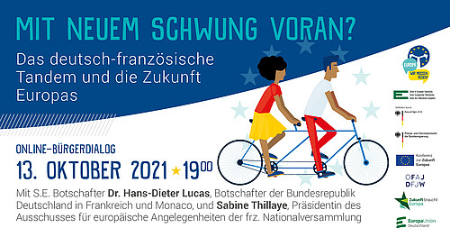 Wie steht es um das deutsch-französische Tandem und welche Rolle kann es mit Blick auf die Zukunft Europas spielen? Bringen Sie sich mit Ihren Fragen auf Deutsch oder Französisch ein und treten Sie in den virtuellen Austausch mit S.E. Botschafter Dr. Hans-Dieter Lucas, Botschafter der Bundesrepublik Deutschland in Frankreich und Monaco, und Sabine Thillaye, Präsidentin des Ausschusses für europäische Angelegenheiten der französischen Nationalversammlung.