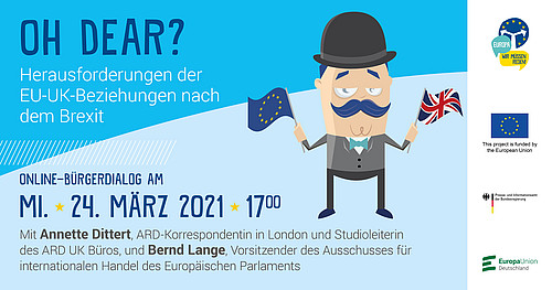 Bringen Sie Ihre Anliegen und Fragen ein bei unserem Online-Bürgerdialog „Oh Dear? Herausforderungen der EU-UK-Beziehungen nach dem Brexit“ und treten Sie in den virtuellen Dialog mit Annette Dittert, ARD-Korrespondentin in London und Studioleiterin des ARD UK Büros, und dem Europaabgeordneten Bernd Lange, Vorsitzender des Ausschusses für internationalen Handel des Europäischen Parlaments.