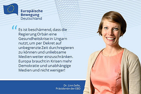 Europa-Union Generalsekretär Christian Moos, Mitglied des Vorstands der EBD, schließt sich den Worten von EBD-Präsidentin Linn Selle an: „Persönlich wie im Namen der überparteilichen Europa-Union Deutschland sage ich in aller Deutlichkeit: Viktor Orbán und die Ungarn regierende Fidesz-Partei stehen nun endgültig außerhalb der europäischen Werte. Alle Verantwortlichen in Deutschland und Europa müssen Budapest unmissverständlich klar machen, dass für einen autoritären Staat kein Platz in der Gemeinschaft ist. Die abschüssige Bahn, auf…