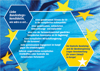 Das Thema Europa darf im Bundestagswahlkampf nicht fehlen. Denn schließlich entscheiden der neue Bundestag und die künftige Regierung mit, welche Richtung die EU einschlägt. Europa-Union und JEF wollen mit ihrer gemeinsamen Kampagne zur Bundestagwahl dafür sorgen, dass die Europapolitik im Wahlkampf stärker in den Fokus rückt.