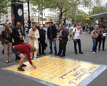 Wie kann Europa demokratischer werden? Dies war das Motto zweier Bodenzeitungen, die Aktive von Europa-Union und JEB am 9. Mai an zentralen Plätzen in Berlin zeigten. Am Ku’Damm und am Hackeschen Markt waren Passanten eingeladen, über Vorschläge für eine aktivere Demokratie auf europäischer Ebene abzustimmen. Die Aktion weckte viel Interesse bei Berlinern und internationalen Gästen und führte zu lebhaften Diskussionen über Europa.